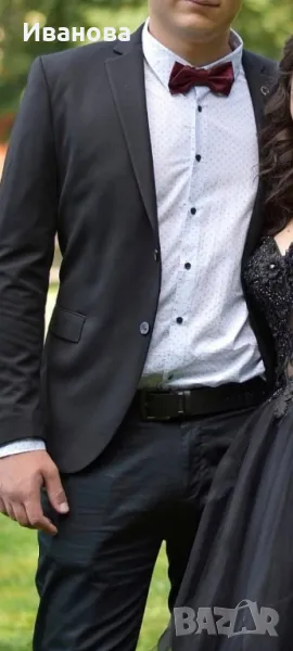 Елегантен костюм лимитирана серия за абитуриентски бал в черен цвят. Подходящ за специални поводи и официални събития. Стилен и удобен за носене през цялата вечер. Костюма се продава от две части - елегантно сако и панталон, размера им е 58. Костюма е много запазен, носен няколко часа в балната вечер!