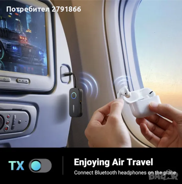 - 3. Двойно сдвояване за споделена музика: Свържете две AirPods или безжични Bluetooth слушалки едновременно чрез Bluetooth приемника. Споделяйте музикални и визуални преживявания с близки или приятели по време на полет с лекота.