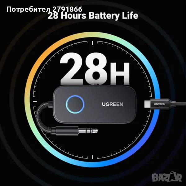 UGREEN Bluetooth 5.2 предавател-приемник 2-в-1 безжичен 3.5 мм Aux 28 часа живот на батерията