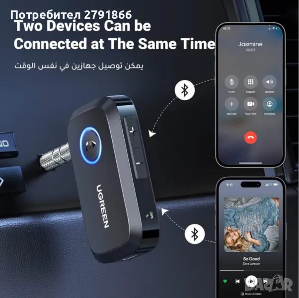 - 【Поддържа се свързване на две устройства】UGREEN Bluetooth 5.3 приемникът поддържа свързване на 2 устройства едновременно. Можете лесно да превключвате устройства за разговори и музика, докато шофирате, и да сменяте музиката с приятелите си на партита.