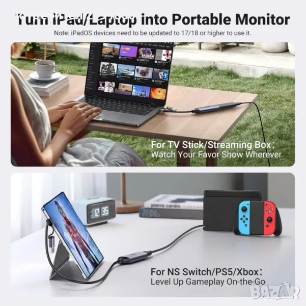 - Дизайн с 2-в-1 USB-A и USB-C интерфейс: Картата за стрийминг заснемане е подходяща за повечето съвременни лаптопи, компютри, таблети, iPad-и, мобилни телефони и други устройства с USB-C и USB-A. Телефонът/таблетът може да се използва като преносим екран за игра на конзолни игри или като монитор за камера. Забележка: PS4 и PS5 поддържат тази карта за заснемане, когато HDCP е изключен.
