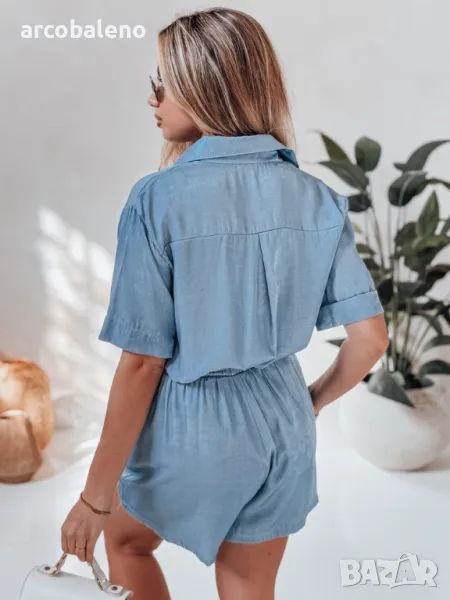 Този дамски комплект с голям размер е задължителен за топлите дни. Къси шорти с джобове и еластична талия осигуряват комфорт и удобство. Ризата с къс ръкав и копчета може да се носи класически или с връзване отпред. Тънката материя прави комплекта идеален за горещите летни дни – той е ефирен, лек и стилен.