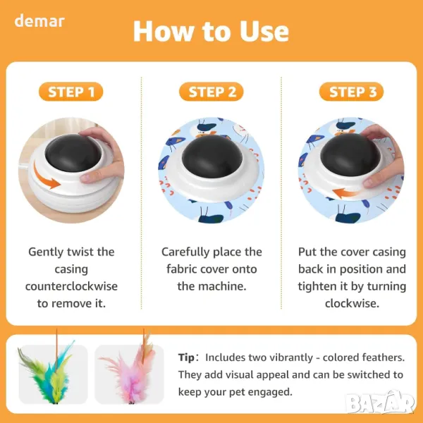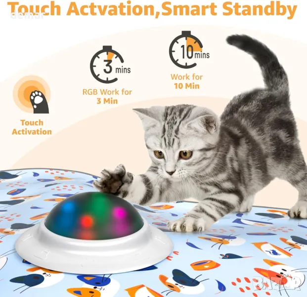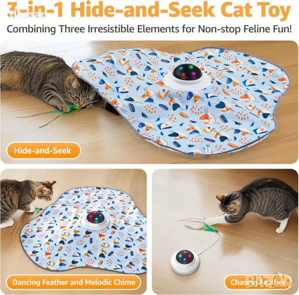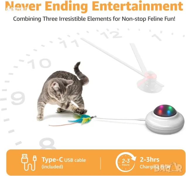 Тази интерактивна играчка за котки разполага с бързо движеща се пръчка от пера под платнено покритие, създавайки игра на криеница със звънчета и непредсказуеми движения, за да държи котките ангажирани. Тя има режими на бавна и бърза скорост, подходяща е както за самостоятелна, така и за групова игра и помага за облекчаване на скуката и насърчаване на упражненията. Интелигентен сензор за движение реактивира играчката с почукване с лапа, след като влезе в режим на готовност, с автоматично изключване за пестене на енергия. Зарежда се чрез USB-C, работи дни с пълно зареждане и се предлага с два цвята пера и подвижен звънец за персонализиране.