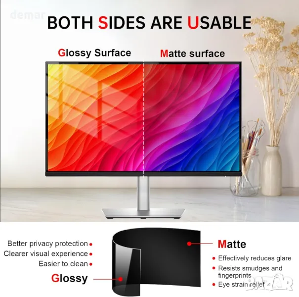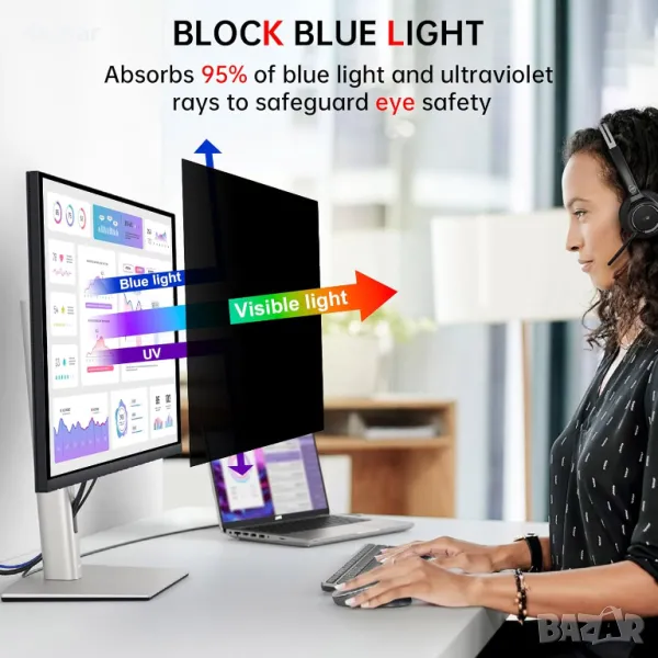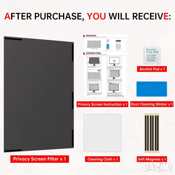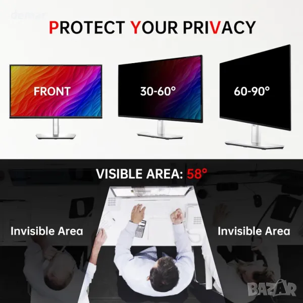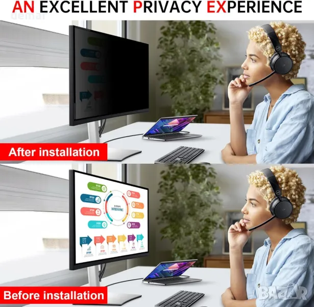 Проектиран за 24-инчови монитори с формат 16:9, този екран за поверителност се инсталира мигновено с магнитни ленти – не са необходими инструменти или лепила. Той ограничава ъглите на видимост до 29°, предпазвайки чувствителна информация от странични погледи, като същевременно запазва ясни изображения отпред. Двустранният дизайн предлага гладка страна за яснота и поверителност или матова страна за намаляване на отблясъците в ярки условия. Той също така филтрира 95% от синята светлина, намалява отраженията и е с устойчива на надраскване повърхност за дълготрайна защита.