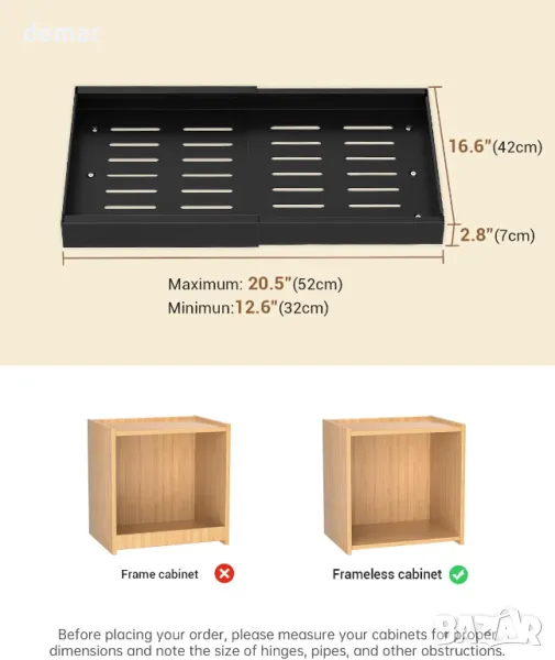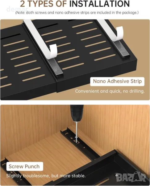 Този регулируем органайзер за шкафове се разширява от 32 до 52 см, за да е подходящ за различни размери шкафове, предлагайки практичен начин за максимално използване на пространството. С нано-лепило без пробиване, той се монтира бързо и стои здраво на мястото си. Двете издърпващи се чекмеджета се плъзгат плавно, осигурявайки лесен достъп до предмети дори отзад, което го прави идеален за използване под мивка в кухни, бани или други помещения. Здравата му конструкция и чистото черно покритие подхождат на различни интериори и гарантират дълготрайна надеждност.