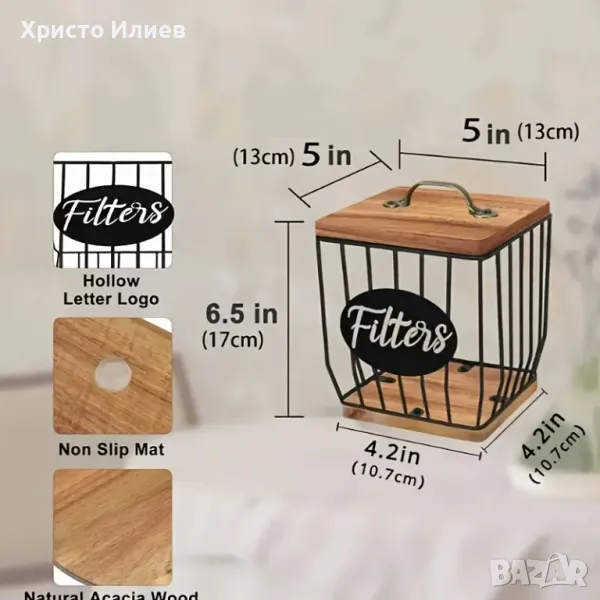 Нашият държач за филтър за кафе с капак е изработен от метал и дърво, с елегантен дизайн и е практичен. Черната метална тел с "филтри" и дизайнът с дървена основа съчетават рустик винтидж стил за вашия филтър за кафе, осигурявайки изключителен стил и удобство за вашата кухня.