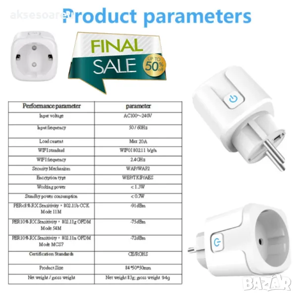 WiFi Smart Plug 20A EU Smart Socket с функция за мониторинг на захранването,