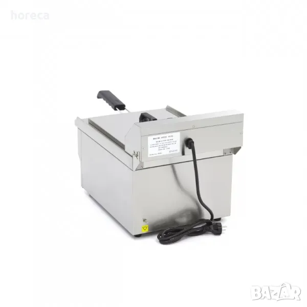 Този фритюрник от MixHoReCa.com е изграден от висококачествена неръждаема стомана, което гарантира неговата здравина и устойчивост на корозия.Обема на резервоара е 18 литра, а максималното количество мазнина, което можете да налеете е 16 литра. Това го прави подходящ за големи количества храни и дава възможност да пържите до 1,7 кг картофи наведнъж. Уредът разполага със защита от претоварване, която предотвратява нежелани инциденти. Подвижният капак ви предпазва от пръските мазнина по време на пържене. Той и кошницата имат термоустойчиви дръжки, за лесно боравене с тях. Фритюрник 16 л - с кран, студена зона и регулируем термостат има 4 гумени крачета, които предотвратяват плъзгане по плота.