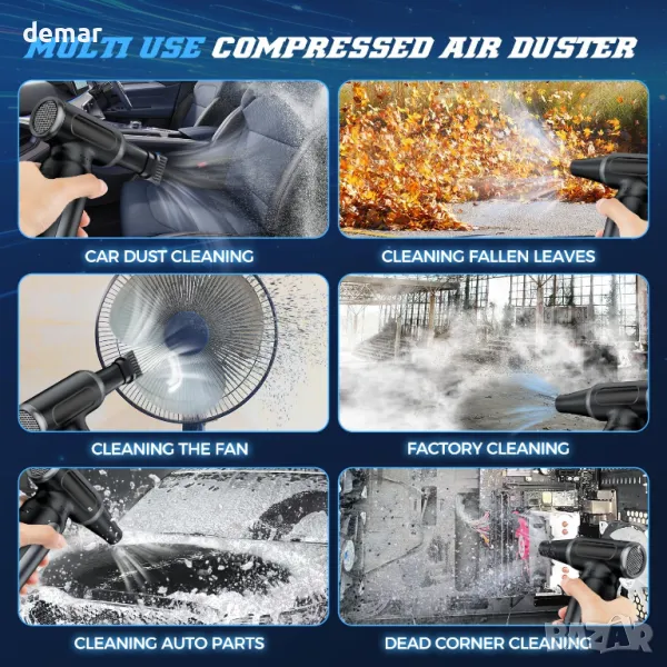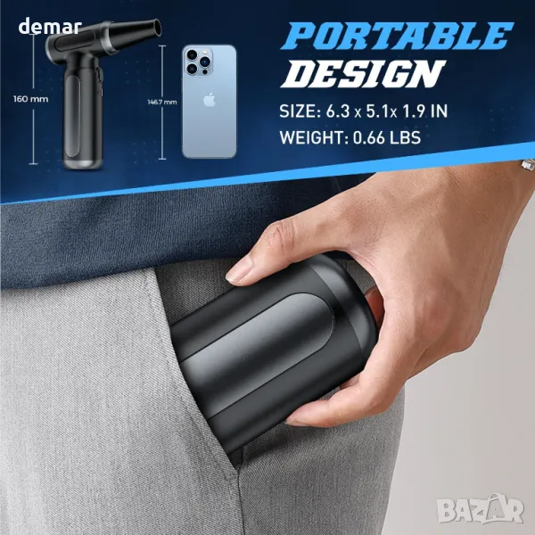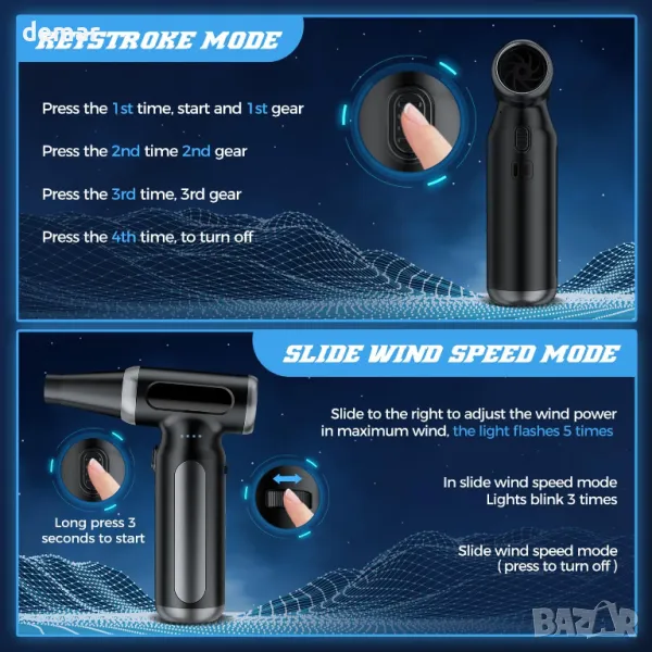 Тази компактна и мощна въздушна четка разполага с турбо вентилатор с до 200 000 оборота в минута и скорост на вятъра над 120 м/сек, което я прави ефективна за дълбоко почистване дори на труднодостъпни места. Включва 3-скоростен режим плюс нов режим на ролка за по-плавно управление, с лек, ергономичен и джобен дизайн за преносимост. Подходяща за различни приложения като почистване на електроника, интериор на автомобили, щори и косми от домашни любимци, тя може също да напомпва предмети и да помага при запалване на огън. Захранвана от акумулаторна батерия от 10 000 mAh с множество защити за безопасност, тя предлага многократна и екологична алтернатива на традиционните въздушни кутии.