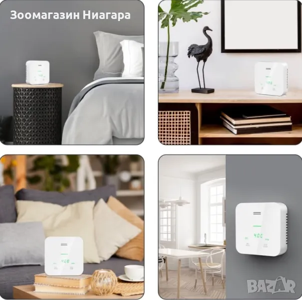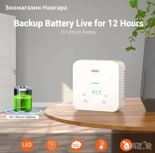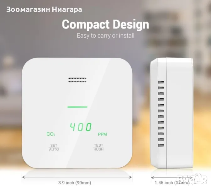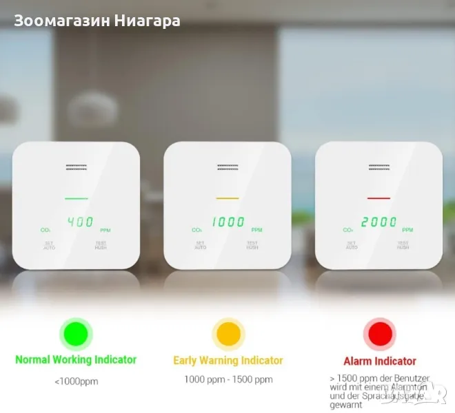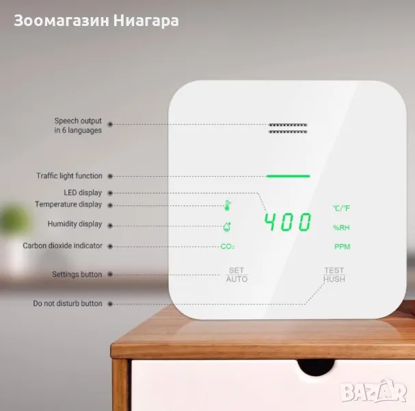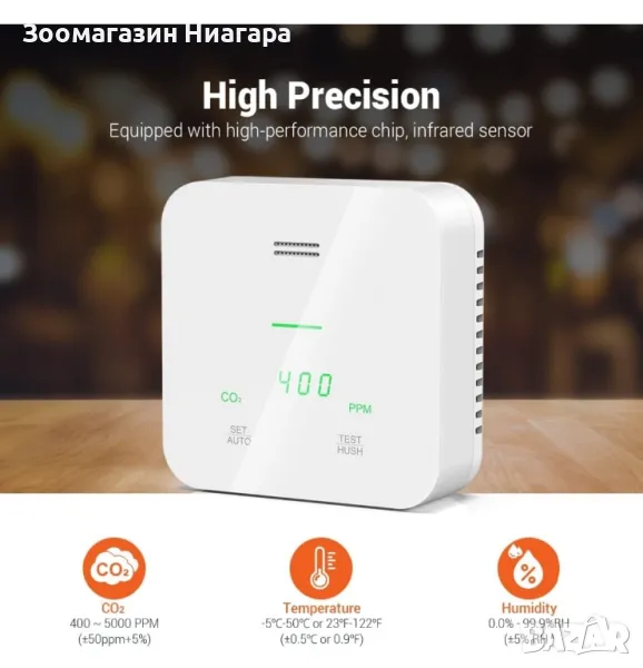 въглероден диоксид, температура и влажност, инфрачервен сензор за въглероден диоксид с висока прецизност и високо прецизен цифров чип за температура и влажност, използван за откриване на съдържанието на въглероден диоксид, температурата и влажността в вътрешната среда и показване на екрана. Когато тестът за въглероден диоксид, температурата или влажността са извън предварително зададената стойност на алармата, продуктът ще бъде под формата на червени, жълти и зелени светлини и гласово напомняне на потребителите.