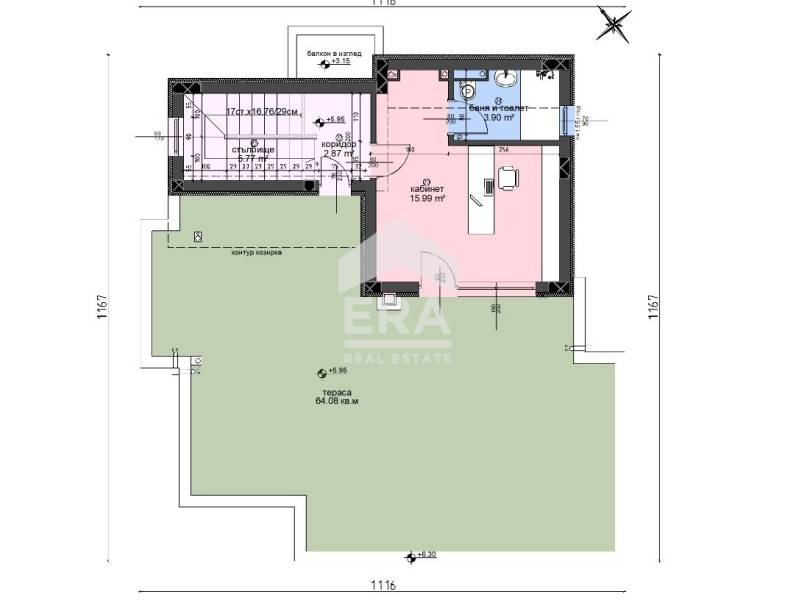 Първият етаж се състои от входно антре (3,9 кв.м), просторна и слънчева дневна с кухненски бокс (41,53 кв.м), спалня или кабинет (12,43 кв.м) със самостоятелна баня с тоалетна (3,9 кв.м), килер (5,44 кв.м) и тоалетна за гости (2,22 кв.м). Вътрешно стълбище води до втория етаж, който разкрива прекрасна морска панорама и включва три спални (12,11 кв.м, 12,3 кв.м и 13,69 кв.м), всяка с дрешник (съответно 4,08 кв.м, 3,93 кв.м и 2,87 кв.м) и баня с тоалетна (4,15 кв.м, 3,07 кв.м и 3,9 кв.м), голям балкон (11,05 кв.м) към две от спалните, коридор (7,23 кв.м) с излаз на втори, по-малък балкон (1,77 кв.м), перално помещение (5 кв.м). Вътрешно стълбище води до третия етаж, на който са разположени кабинет/спалня (16 кв.м) с баня и тоалетна (3,9 кв.м) и обширна тераса (64,08 кв.м). Изложението е юг/изток/запад.