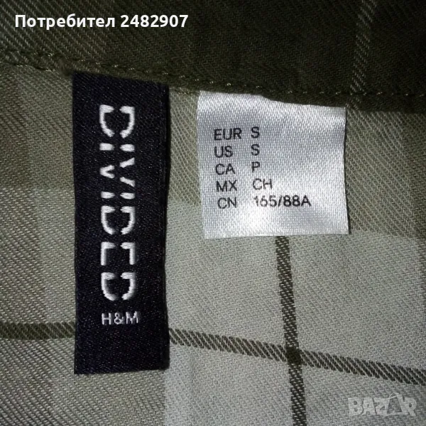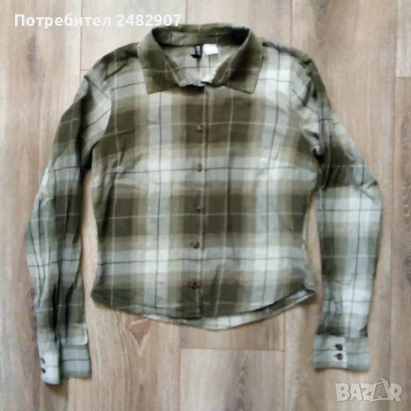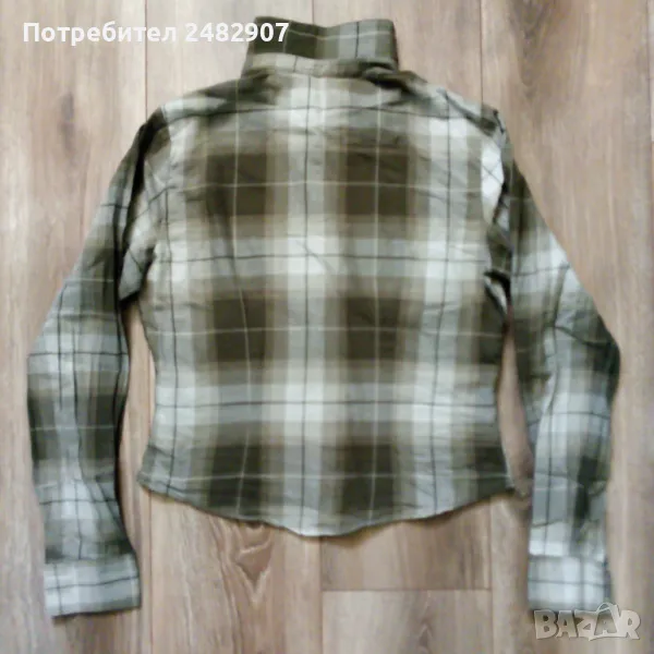 Вталена къса дамска риза в маслено зелен цвят, размер S. Съдържа 100 % памук. Ширина в раменете - 38 см, ширина под мишниците - 47 см, ширина в долната част - 43 см, дължина от рамото до долу - 54 см, дължина на ръкава от рамото - 60 см, ширина на ръкава в долната част - 10,5 см. Много запазена, почти не е използвана, без забележки.