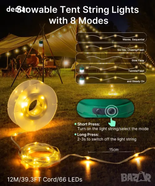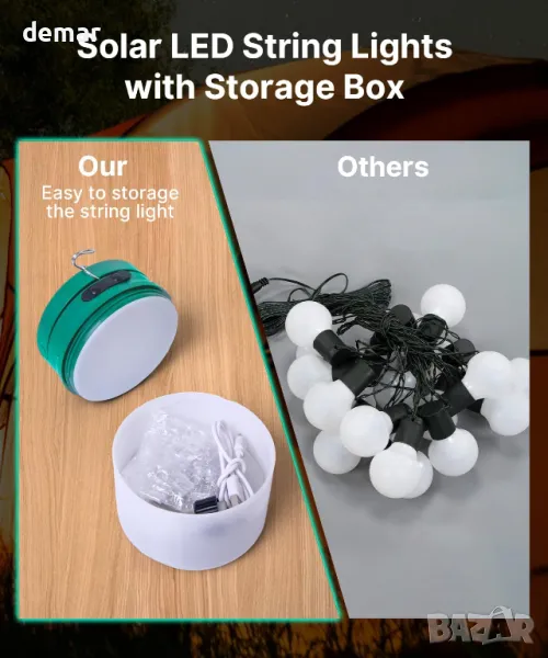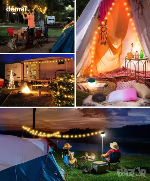 Къмпинг гирлянди - 2 в 1 соларни и USB акумулаторни, 3600mAh, 8 режима, водоустойчиви, 12 метра