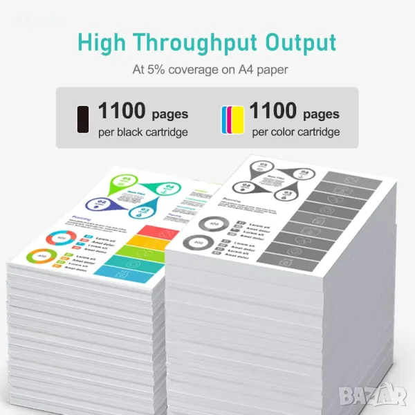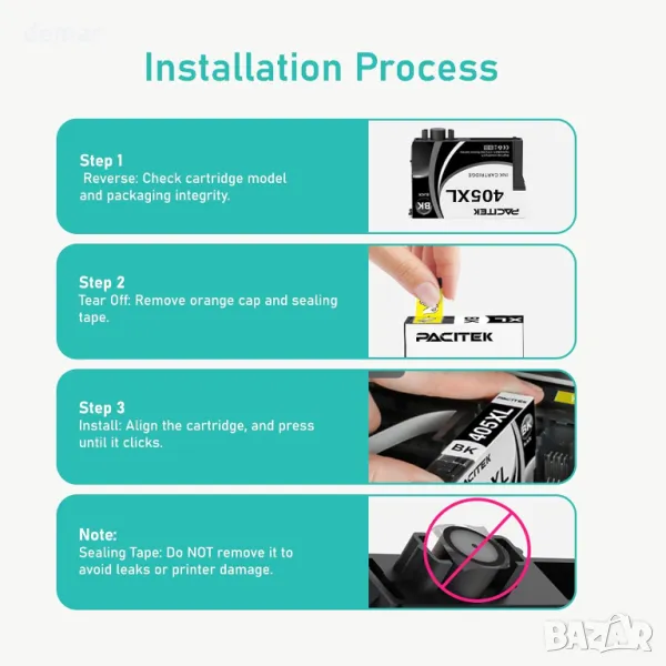Включва 10 мастилени касети 405XL с висок капацитет (4 черни, 2 от всяка - циан, магента, жълто), съвместими с принтери Epson Workforce Pro WF-7830DTWF WF-4820DWF WF-3820DWF WF-7840DTWF WF-4830DTWF WF-4820DWF WF-3825DWF WF-4825DWF WF-7835DTWF. Всяка касета отпечатва до 1100 страници при 5% покритие. Разполага с актуализирани чипове за надеждно разпознаване, лесна инсталация и плавен, ярък печат, използвайки специално багрилно мастило. Подходяща за употреба в офиси, домове, училища и други.