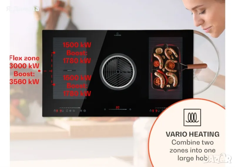Право в средата: DownAir systém Full House 3.0 oт Klarstein носи революция в кухнята, като комбинира своя индукционен плот с DownAir абсорбатор. Още по-подобрен вече 3-та генерация изисква минимално пространство и при това е толкова мощен, колкото никога преди.Индукционният плот DownAir Systému Full House 3.0 от Klarstein носи във вашата кухня четири мощни котлона. В дясно и в ляво около кръглия отвор за всмукване се намират две зони за готвене и благодарение на VarioHeating системата практически можете да ги свържете в една гъвкава зона, например за големи касероли или тенджери и тигани.В средата на вашата кухня тупти мощно всмукващо сърце: абсорбаторът DownAir с режим на рециркулация. С оглед на това, че е част от плота, не се набива на очи с външния си вид и направо абсорбира миризмите и изпаренията. Затова се вписва перфектно в кухни с централен остров, както и в по-тесни кухни. Със своята силна система AeroEfficiency- и мощност от 655 м³/ч е изключително ефективен и е невидимо скрит под работния плот.Мощността на зоните за готвене, както и DownAir системата се управляват със сензорен панел. Всички елементи за управление са вградени в стъклената плоскост, така че никакви копчета да не нарушават външния вид. DownAir абсорбатора можете да използвате с извличане на въздух или в режим на рециркулация. Функцията за разпознаване на тенджери, функцията Stop and Go с ThermalRecall функцията, разпознаването на остатъчна топлина, таймерът, детският предпазител допълват идеално възможностите за използване на плота.