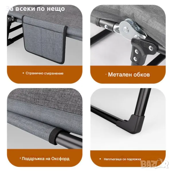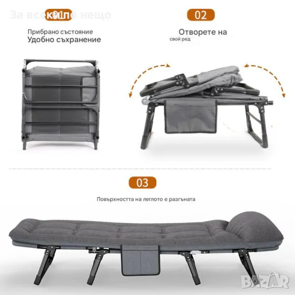 Лесно сгъваемо и компактно: Леглото лесно се сгъва и се съхранява в малко пространство, което го прави удобно за малки жилища, офиси и пътувания.