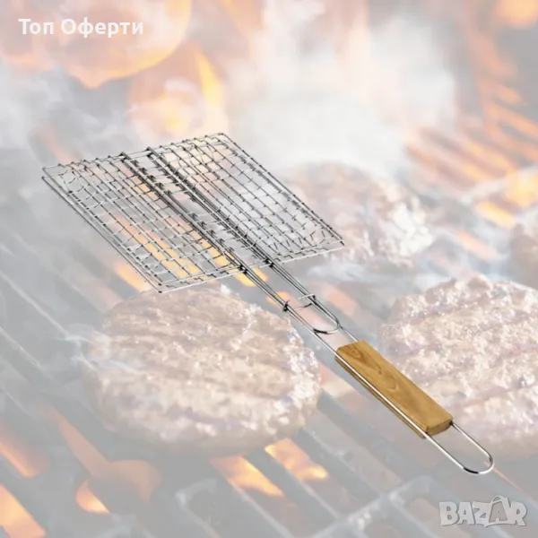 Размери: 22.5 x 20 x 52 cm;Материал: метална решетка с дървена дръжка;Заключващ механизъм за безопасно обръщане на храната;Устойчива на високи температури;Лесна за почистване.