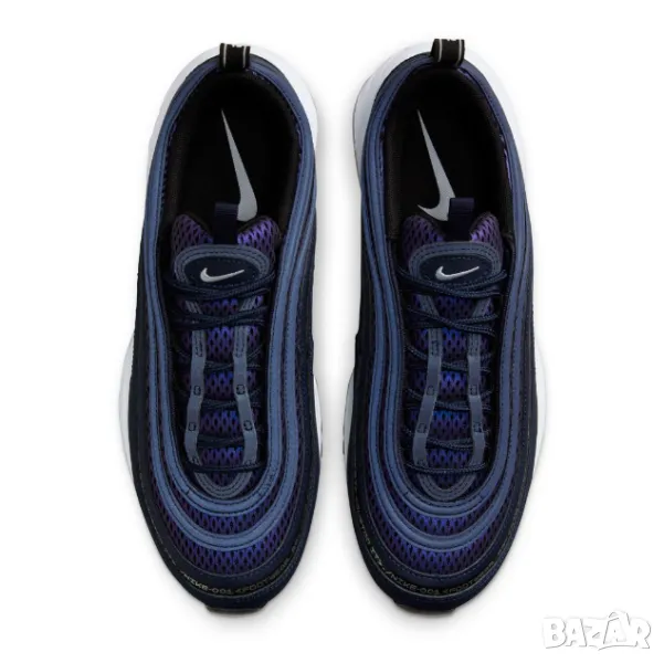 Nike Air Max 97 „Just Do It“ Purple Navy е стилно допълнение към колекцията „Just Do It“ на Nike. Той се отличава с богата лилава горна част от отворена мрежа, съчетана със странични панели от тъмносини мрежа и калници от набук.