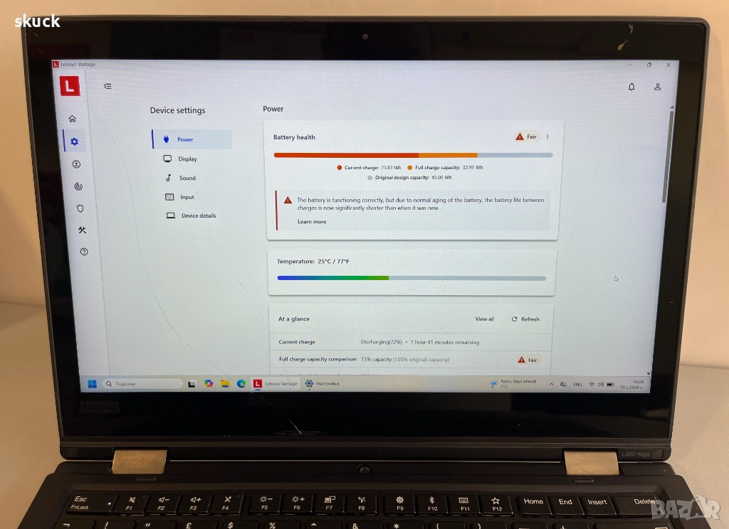 Батерия - фабричен капацитет: 45000 mWh, капацитет при пълно зареждане: 32910 mWh, ниво на износване: 26% (време на работа около 2 часа)