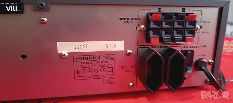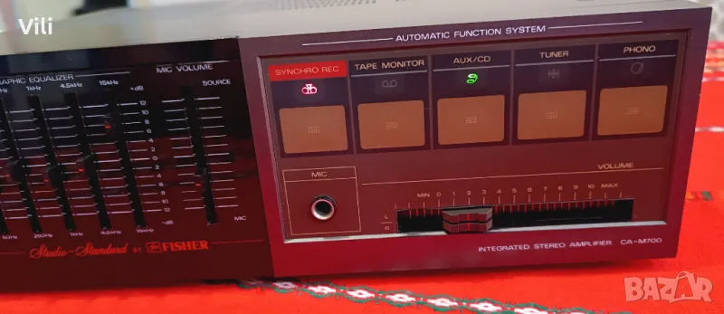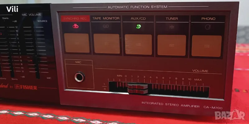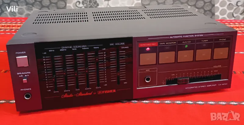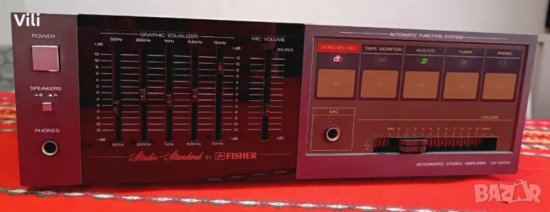 Fisher CA-M700.Работи и изглежда отлично.Цена:75 евро.GSM:0889886377.Fisher CA-M700 е стерео усилвател, който е част от компактната Hi-Fi система Fisher M-700,произвеждана в Япония.Продуктите от тази серия са известни с елегантния си дизайн и надеждно аудио качество, характерно за марката Fisher по онова време.