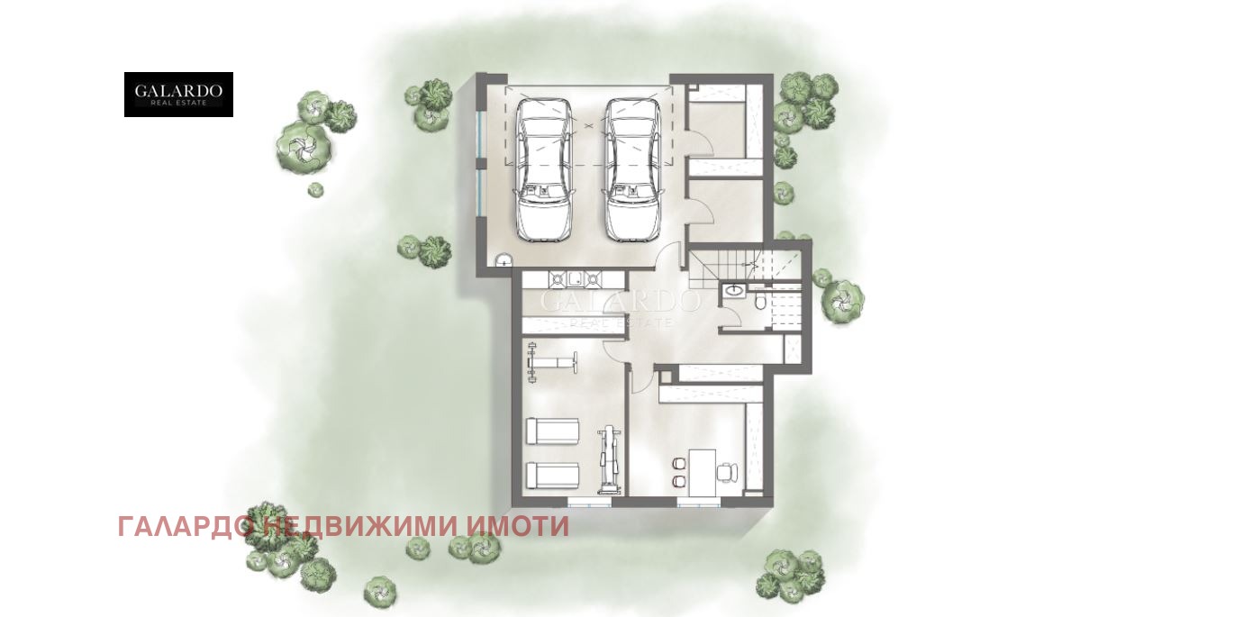 Къщата разполага с 4 спални със самостоятелна баня с тоалетна, самостоятелна кухня, кабинет, фитнес, 2 гаража и 3 паркоместа.