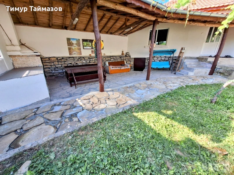 Навес около 50кв.м с голяма маса, пейки, пещ, диван и вътрешни стъпала към къщата и с малко дворче към къщата разделено от същинският двор.