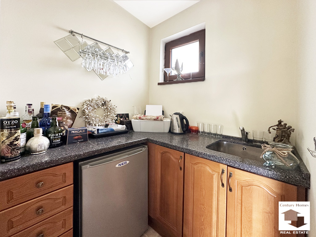 С обща жилищна площ от 180 кв.м., къщата е функционално разпределена на четири нива, свързани с елегантно вътрешно стълбище. Входът от улицата води до приветливо входно антре и светло пространство с отворен план, което съчетава напълно оборудваната кухня с красиви модерни шкафове, гранитен плот и бар за закуска, трапезария, дневна и тоалетна за гости във входното антре. Големи, френски прозорци отварят помещението към слънчева тераса с незабравима гледка идеално място за семейни обяди или спокойни моменти с изглед към историческия силует на града.