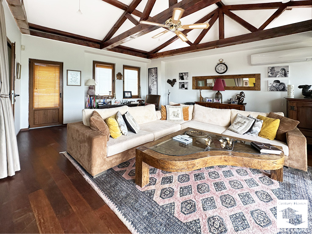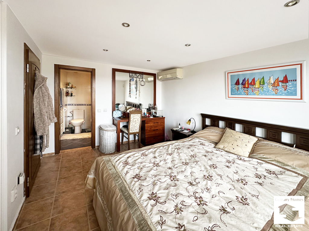 Интериорът е завършен с дървен паркет в дневната на последния етаж и теракотена настилка в останалите помещения. PVC дограма, дървени интериорни врати и стени, боядисани с латекс, допълват уютната и елегантна атмосфера. Отоплението е решено с електрическо подово отопление на втори и трети етаж, електрически конвектори в големите спални и шест климатика, които осигуряват комфорт през цялата година. Сградата е с външна изолация, както и с изолиран покрив и тавани.