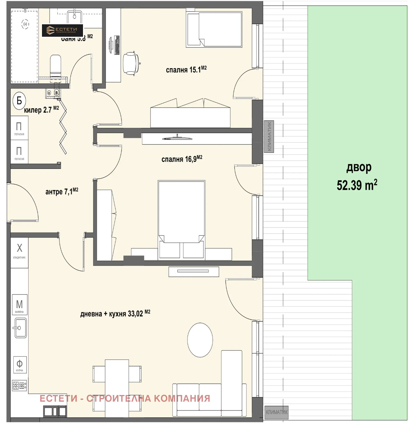 🏠Тристаен апартамент, състоящ се от: антре, дневна с кухня, 2 спални, баня с тоалетна, килер, собствен двор с площ - 52.39кв.м. Квадратура - 105 кв.м.