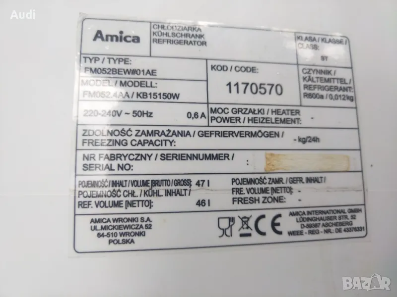 Хладилник тип мини бар AMICA Общ полезен обем 47 литра. Хладилна камера с обем 42. Фризер 4л
