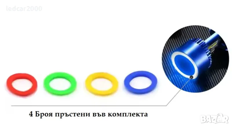 Във комплекта има 4 броя пръстени за Angel Eyes (Жълт,Червен,Син,Зелен) Които може да сменяте по ваш вкус. Ако няма никакъв пръстен, свети основният бял цвят.