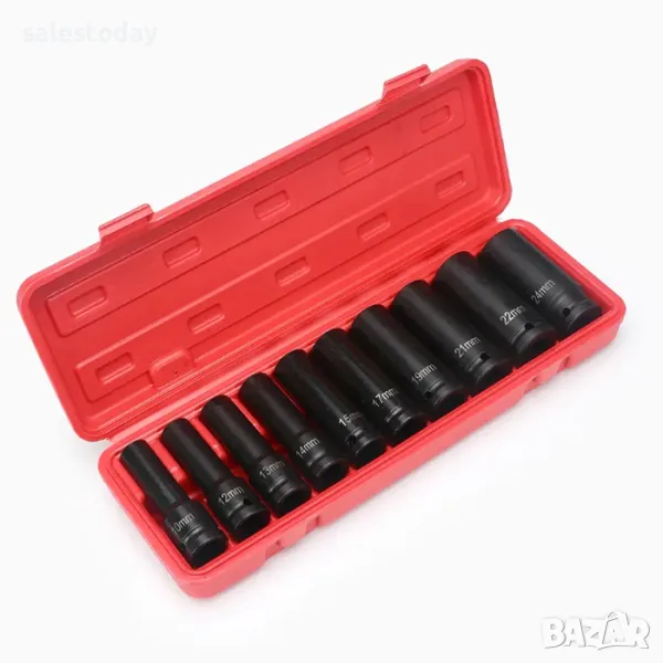 Професионален комплект от 10 броя дълбоки ударни вложки, подходящи за работа с пневматични и електрически гайковерти. Осигуряват здраво и сигурно захващане при развиване и завиване на болтове и гайки.