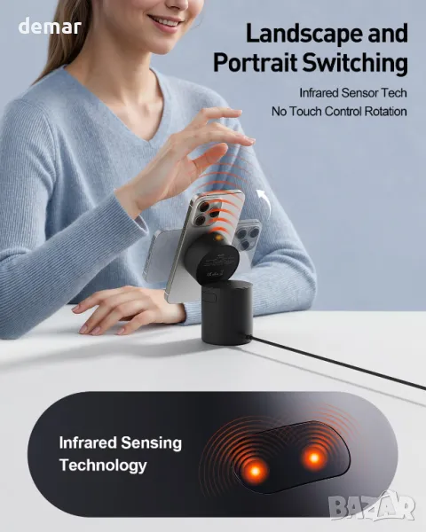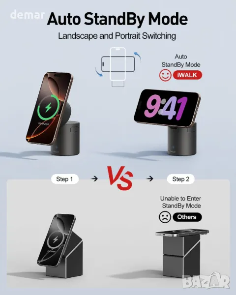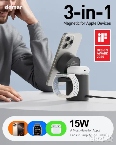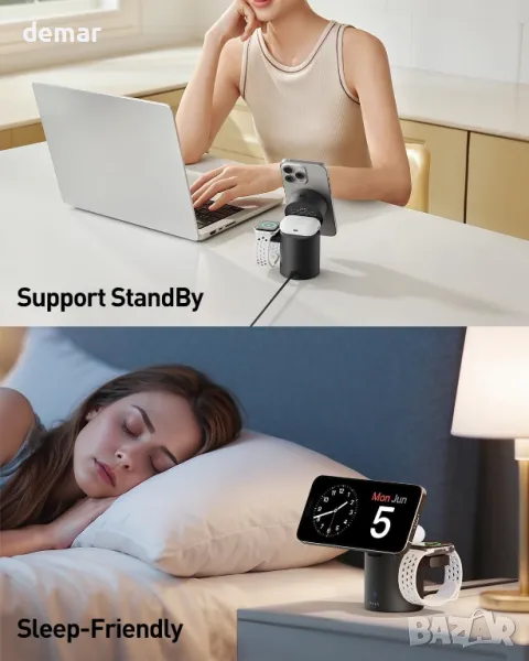 Тази безжична зарядна станция 3 в 1 поддържа едновременно зареждане на iPhone, iWatch и AirPods, с широка съвместимост с всички поколения устройства на Apple. Тя разполага с безконтактен автоматичен режим на готовност, използващ технология с инфрачервени сензори, което позволява на телефона да превключва между пейзажен и портретен режим без усилие. Стойката е регулируема до 65° за удобни ъгли на гледане, а мощният магнит N52 осигурява силно и прецизно подравняване за стабилно и бързо зареждане с 15W. Комплектът включва 20W адаптер, USB-C кабел и ръководство за потребителя.