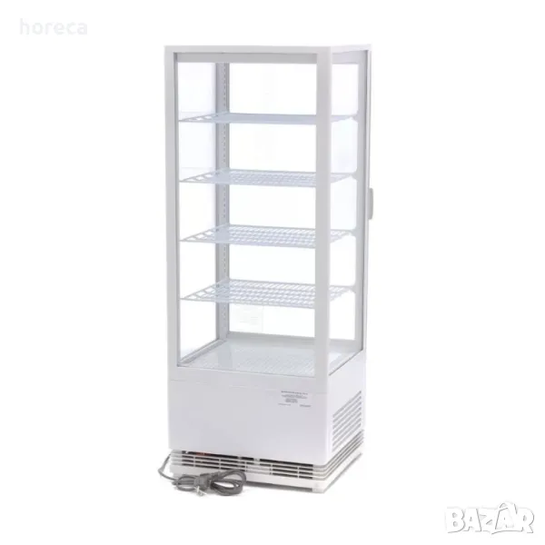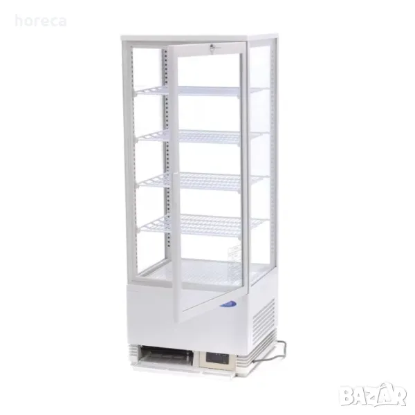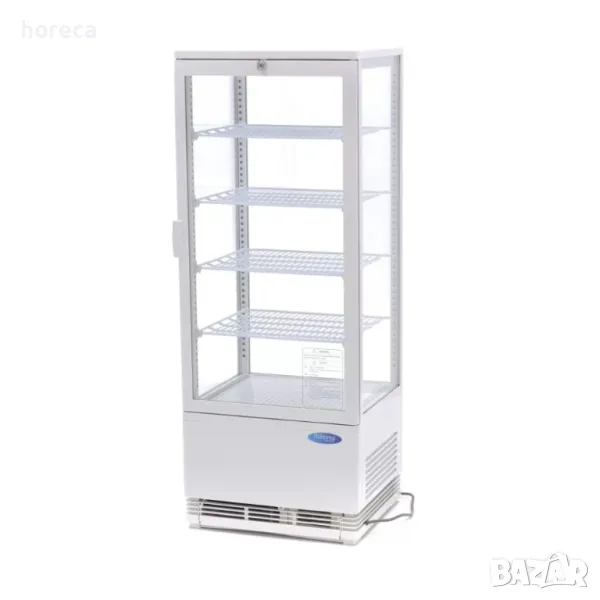 Професионална хладилна витрина е с капацитет 98л. Температурен диапазон 0° и +12°C. Температурата ѝ на охлаждане може да бъде прецизно настроена, благодарение на цифров температурен контролер. Хладилната витрина е подходяща за поставяне върху бар плот. Снабдена е с четири стъклени витрини с двоен стъклопакет и вграденото LED осветление. Мини хладилната витрина е оборудвана с уникален цикъл на охлаждане, който намалява образуването на лед. Ако във витрината има лед, функцията за автоматично размразяване гарантира, че той ще бъде разтопен. Функцията се задейства по веднъж на всеки шест часа. Хладилният агент, използван в тази витрина, е R600a и не съдържа CFC. Снабдена е с 4 решетки с покритие,.