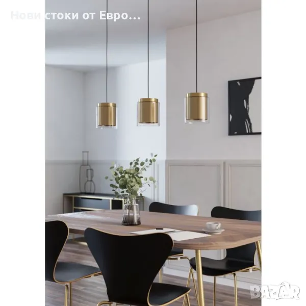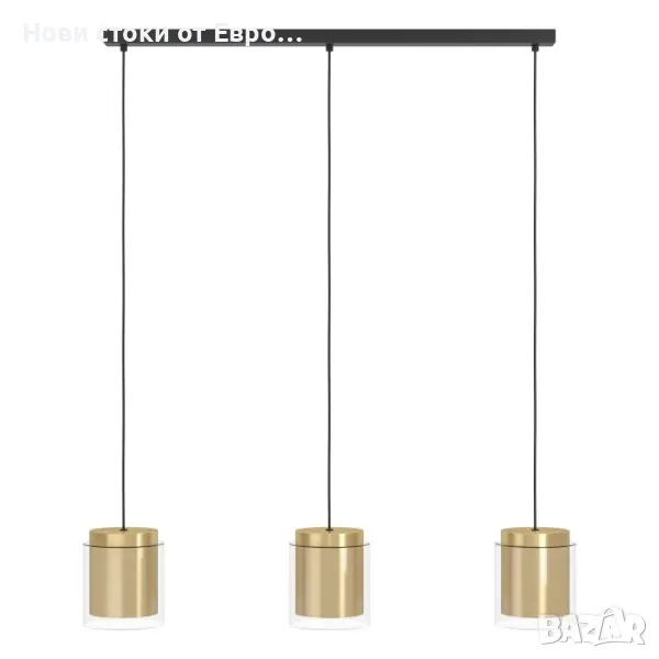 EGLO LAGUNITAS висящо осветително тяло/пенделПенделът LAGUNITAS е направен от три цилиндрични абажура от прозрачно стъкло, всеки от които е комбиниран с вътрешен метален цилиндър от полиран месинг. Висящата лампа със семпъл, елегантен дизайн се характеризира с плавния си преход от метални към стъклени елементи и със своите черни текстилни кабели идеално допълва модерното обзавеждане. Предлага стилно осветление в хола или трапезарията, например над продълговата маса за хранене.