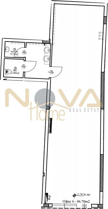Нова Хоум Ви представя за продажба помещение със статут на офис, разположено на партерен етаж в сграда със смесено предназначение. Върху чиста площ от 86,70 кв.м. са разпределени една голяма зала, малък кухненски бокс и тоалетна с предверие.