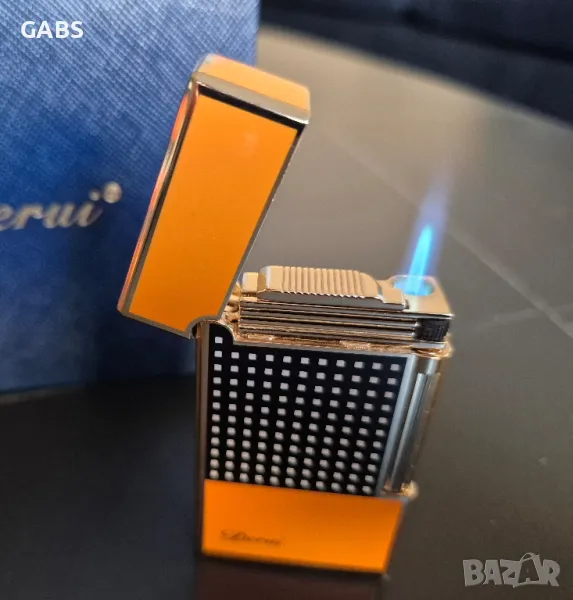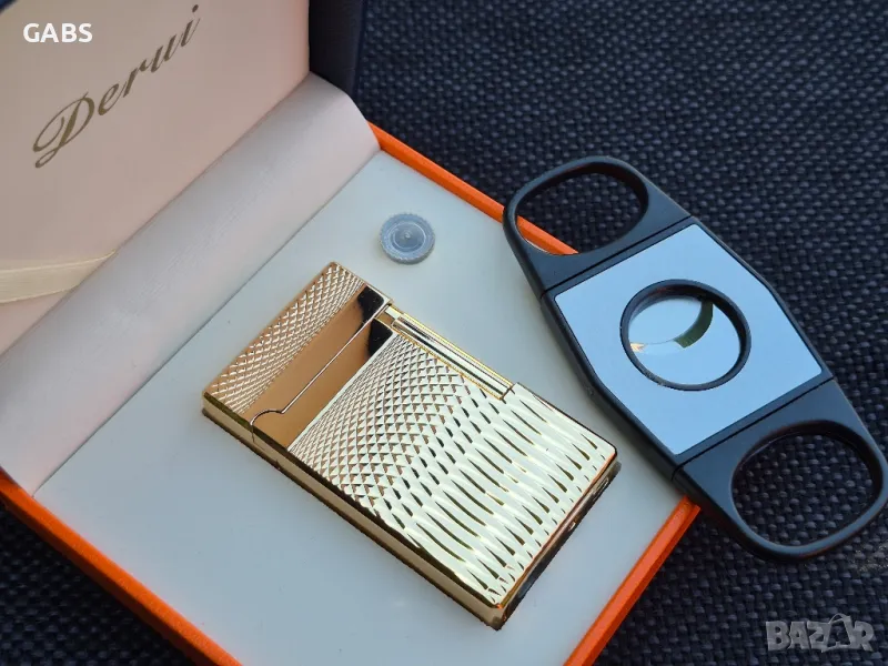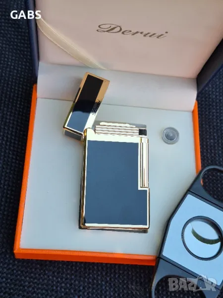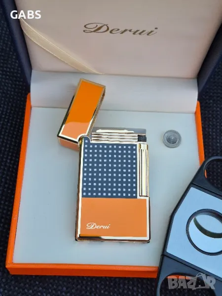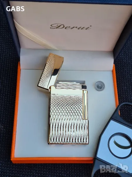 Луксозна газова запалка за пури Derui с вграден пънч.Пламък тип джет.Пълни се и се регулира.Предлага се в стилна подаръчна кутия в комплект с допълнителни камъчета и подарък резачка за пури.