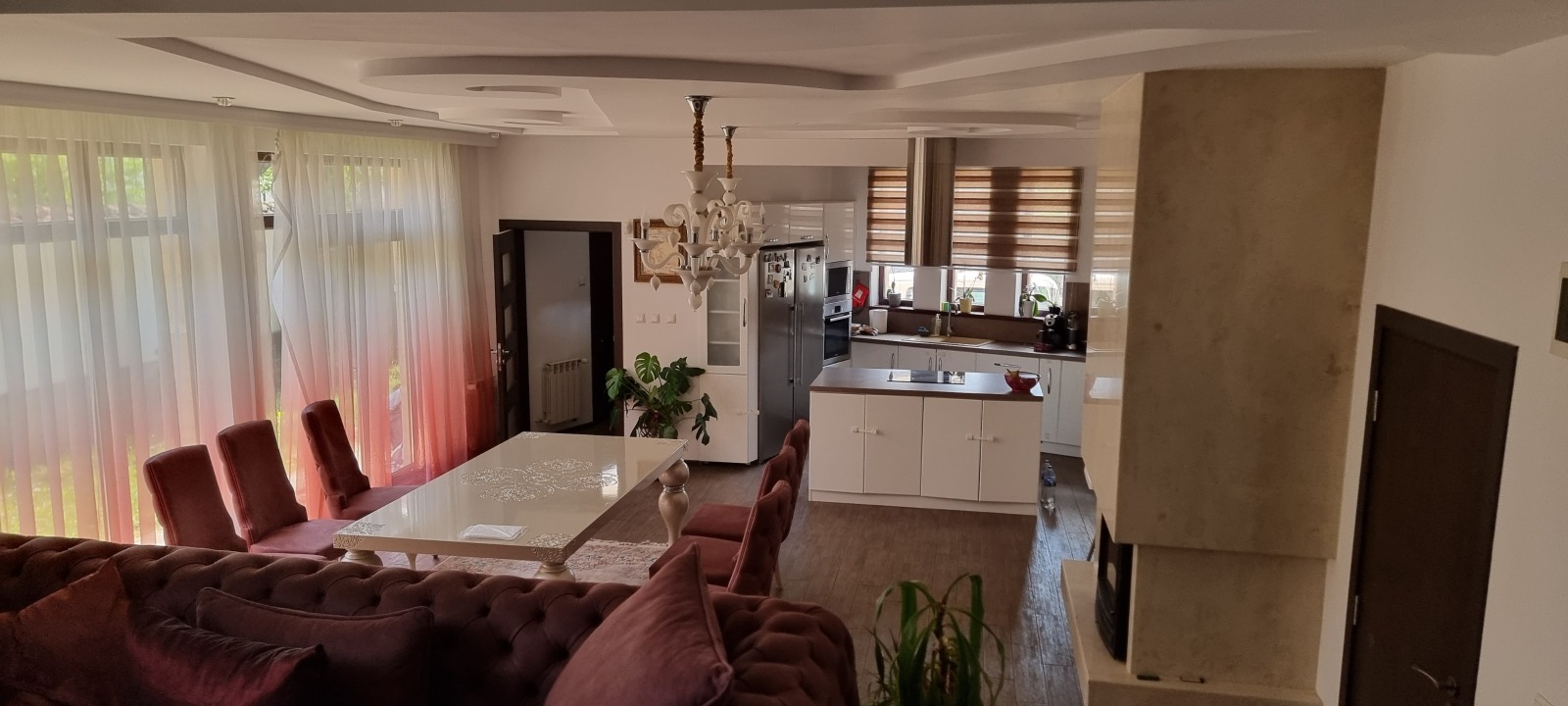 Просторно и светло входно антре, хол на по високо ниво, голяма дневна с трапезария и кухня в отворен план, с директен излаз към двора идеално за семейни събирания и отдих. Налична е и баня с тоалетна, Сутерен фитнес, котелно и гараж с топла връзка.