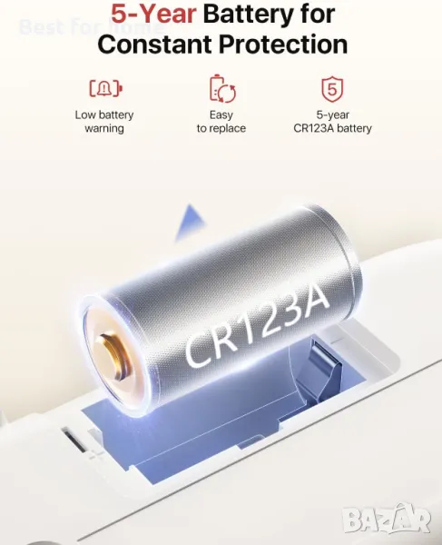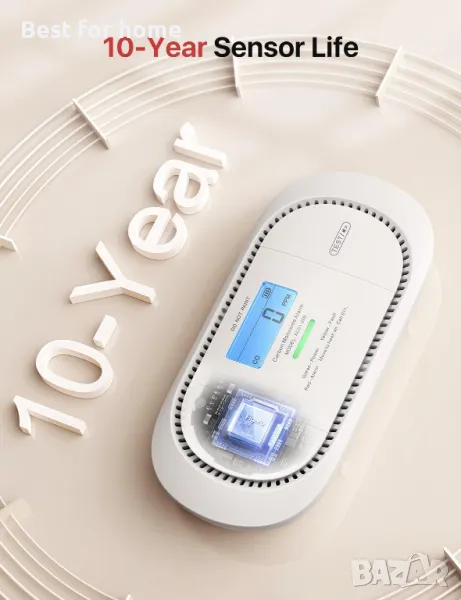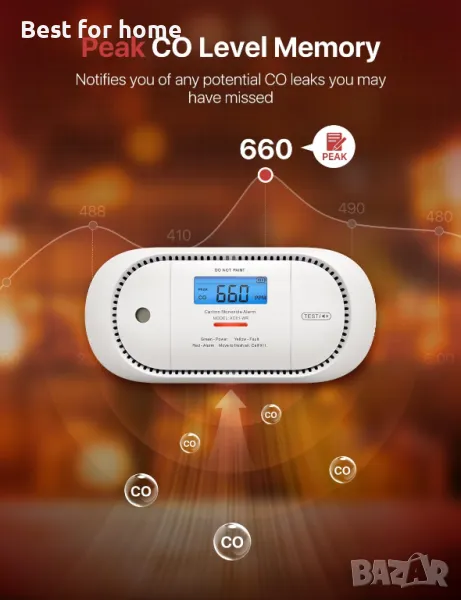 Алармен апарат за въглероден оксид, работещ с батерии: Оборудван с електрохимичен CO сензор Figaro, който осигурява стабилна работа в продължение на 10 години; сменяемата батерия издържа 5 години