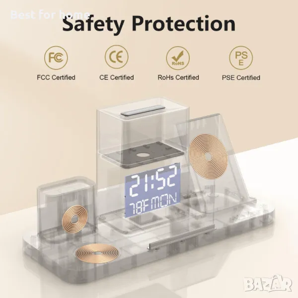 Специална функция Показване на температура, време и седмица, нощна светлина с докосване, безжично зареждане, Bluetooth синхронизация на времето, държач за мобилен телефонПоказване на температура, време и седмица, нощна светлина с докосване, безжично зареждане, Bluetooth синхронизация на времето, държач за мобилен телефон
