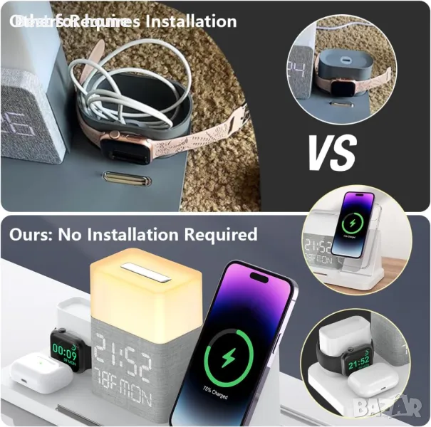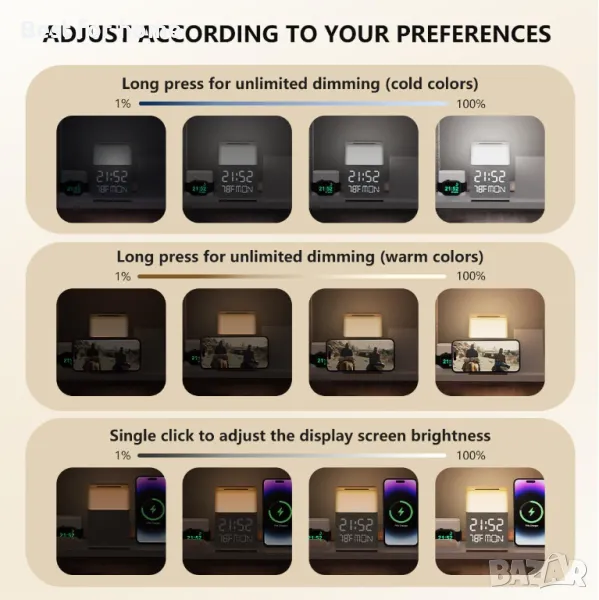 【Регулируема с докосване светлина】 - Безжичната зарядна станция се предлага с 3 вида регулируема светлина: топла светлина, естествена светлина и студена светлина. Яркостта на цифровия дисплей, времето и температурата също могат да се регулират чрез докосване. Регулируемата яркост е от 0% до 100%, можете да я настроите на най-комфортната яркост, която не влияе на съня.
