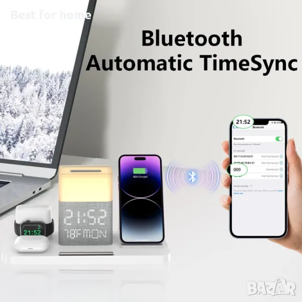【Автоматична синхронизация на времето чрез Bluetooth】 - Най-голямото предимство на тази безжична зарядна станция е, че тя може автоматично да синхронизира времето чрез Bluetooth. Операцията е много проста. Отворете Bluetooth връзката на мобилния си телефон и намерете "009". Връзката е успешна и можете да синхронизирате. В допълнение към синхронизирането на времето, можете да видите и деня от седмицата и вътрешната температура, показани на нея.
