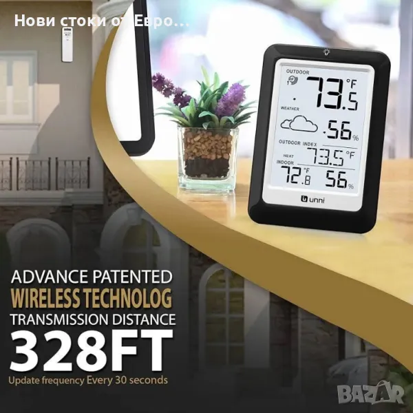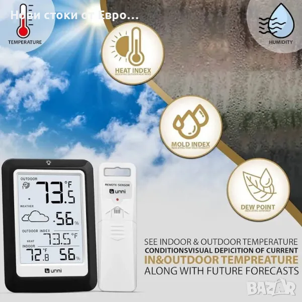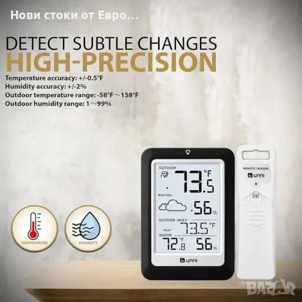 метеорологична станция, монитор за температура и влажност, захранван от батерии, термометри за вътрешен и външен монтаж с дистанционен сензорВисокопрецизен измервател на температура и влажност: Нашият термометър и хигрометър за вътрешен въздух е снабден с високопрецизен сензор, произведен в Швейцария, което го прави изключително точен. Диапазонът на вътрешната температура е +14.2°F ~+122°F, диапазонът на външната температура е -58°F ~+158°F, диапазонът на вътрешна/външна влажност е 1~99%, точността на температурата е +/-0.5°F, а точността на влажността е +/-2%.Патентована технология: Unni разполага с усъвършенствана патентована безжична технология, която осигурява по-мощно и стабилно предаване на данни. Персоналният безжичен монитор за температура и влажност актуализира и предава данни за температура и влажност в радиус до 100 метра на всеки 30 секунди, помагайки ви да наблюдавате всички места, които са най-важни за вас.Специални характеристики: Спрете да се притеснявате за времето. С нашия безжичен термометър и хигрометър можете да видите прогнозата за времето, както и температурата и влажността на закрито и на открито, в реално време. Можете също да видите топлинния индекс, индекса на точката на оросяване и индекса на мухъл за всички местоположения на сензорите на екрана.Голям дисплей с подсветка: Дисплеят е компактен и лесен за четене с удебелена, черна информация. С дизайн за плот или стенен монтаж, можете да го поставите на място, което е достъпно и лесно за виждане. Натиснете бутона за подсветка и тя ще светне за 10 секунди, за да можете да четете на тъмно.Какво получавате: Получавате вътрешен термометър с дисплей, външен сензор, Поддържа до 3 сензора, моля, уверете се, че са на различни канали.