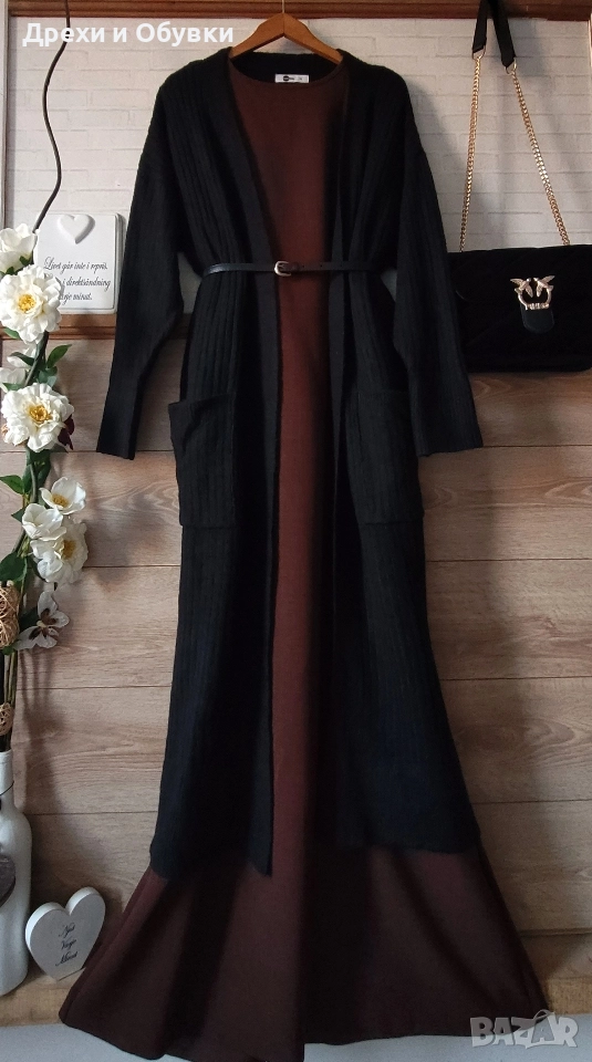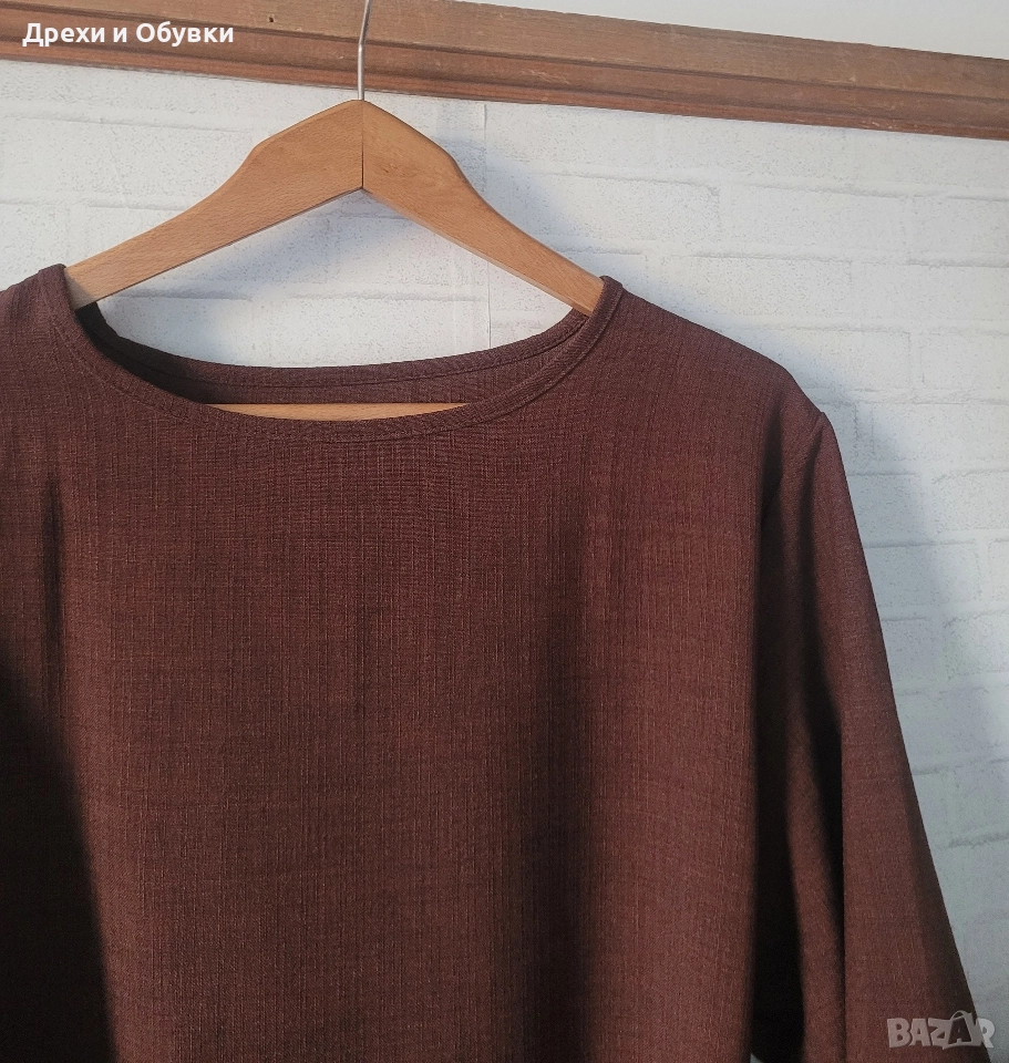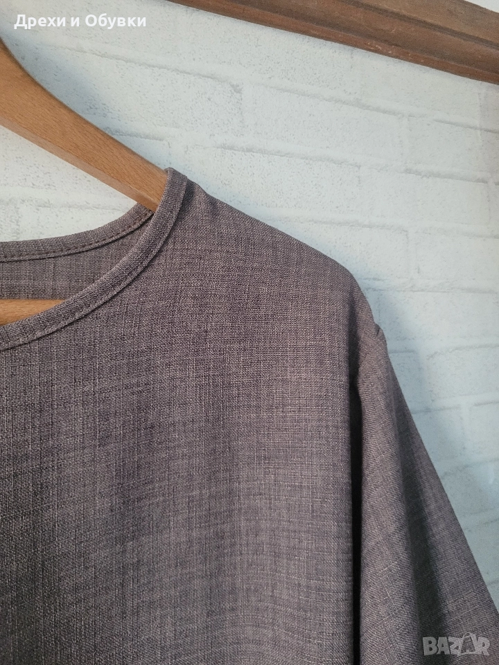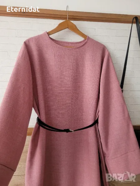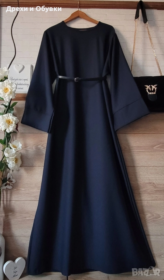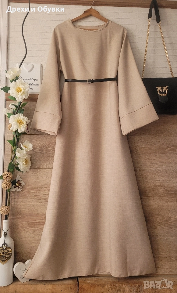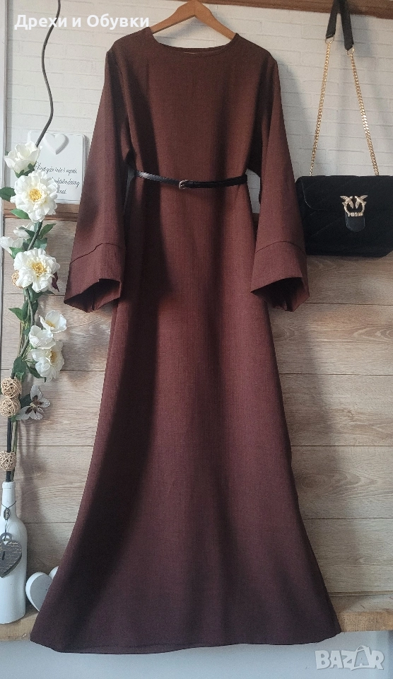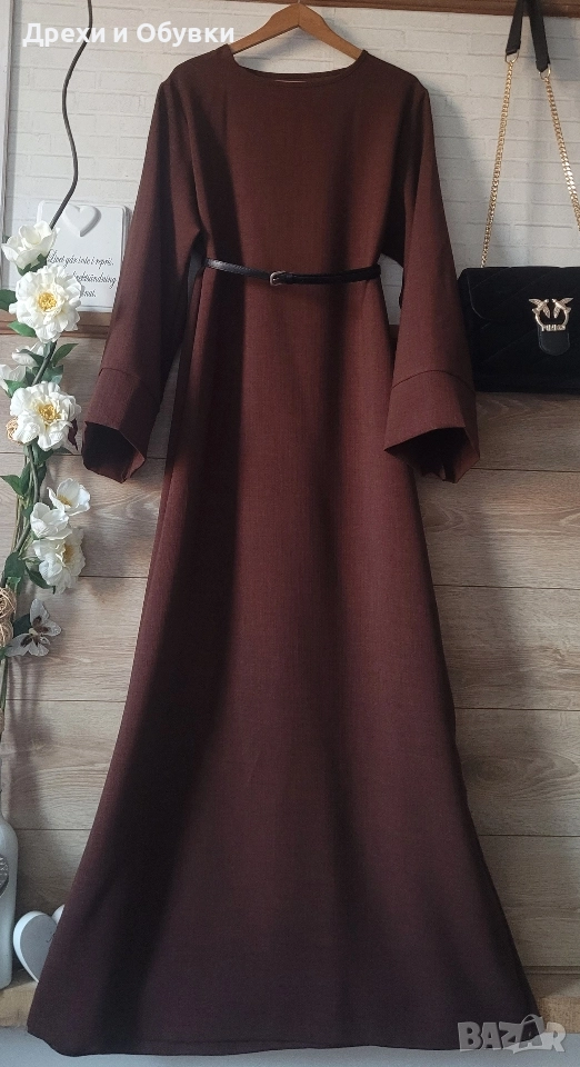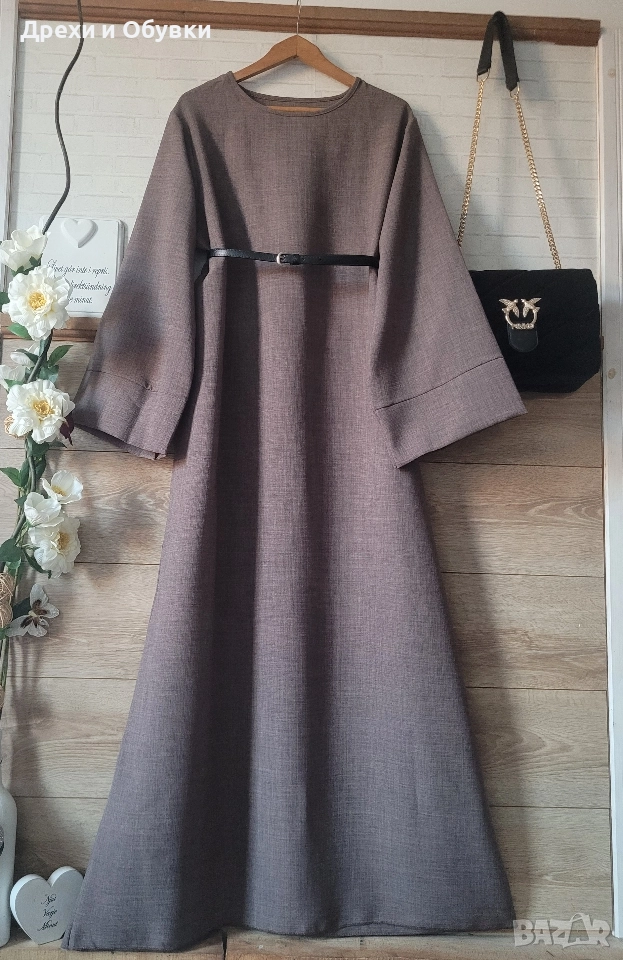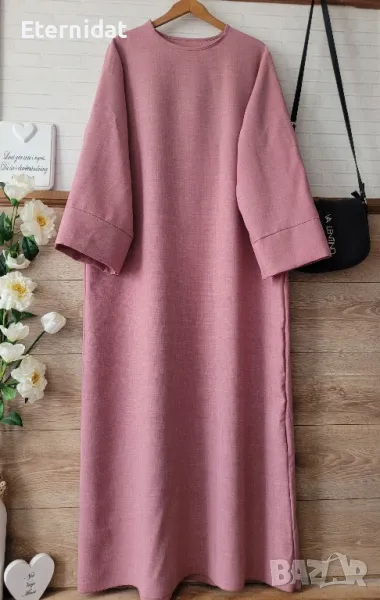 Нова дълга разкроена рокля в изчистен дизайн. Подходяща както за повод с елегантна обувка декорирана с красиви бижута по избор, така и за ежедневието с кецове. Модела се предлага в няколко цвята ( ще бъдат качени в отделни публикаци , както и в коментар). - тъмно син -светло бежов -розов -тъмно кафяв - светло кафяв Размера отговаря на ХЛ ( води се универсален). Гръдна до 118см ( носи се свободно). Цена за бр. 39лв