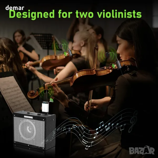 Q2/VT-5 е двуканална UHF безжична микрофонна система, проектирана за две цигулки, предлагаща стабилно предаване до 40 метра с ултраниска латентност и висококачествен звук чрез чувствителен кондензаторен микрофон. Тя разполага с 20 регулируеми канала за намаляване на смущенията, поддържа до четири системи едновременно и включва инфрачервено автоматично сдвояване и честота на семплиране 48 kHz. Всеки лек предавател се закрепва здраво към цигулката със силиконова пружинна щипка и регулируема гъша шия, осигурявайки стабилно прилягане без повреди.