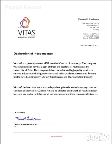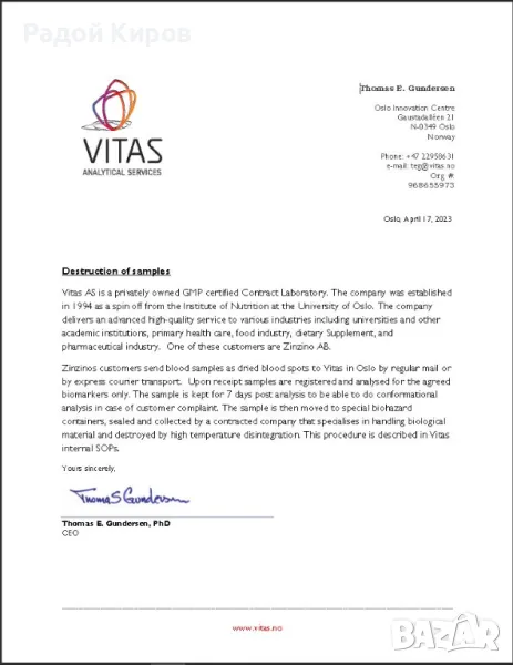 Анализ: Извършва се в сертифицирана лаборатория (Vitas Analytical Services, Норвегия).
