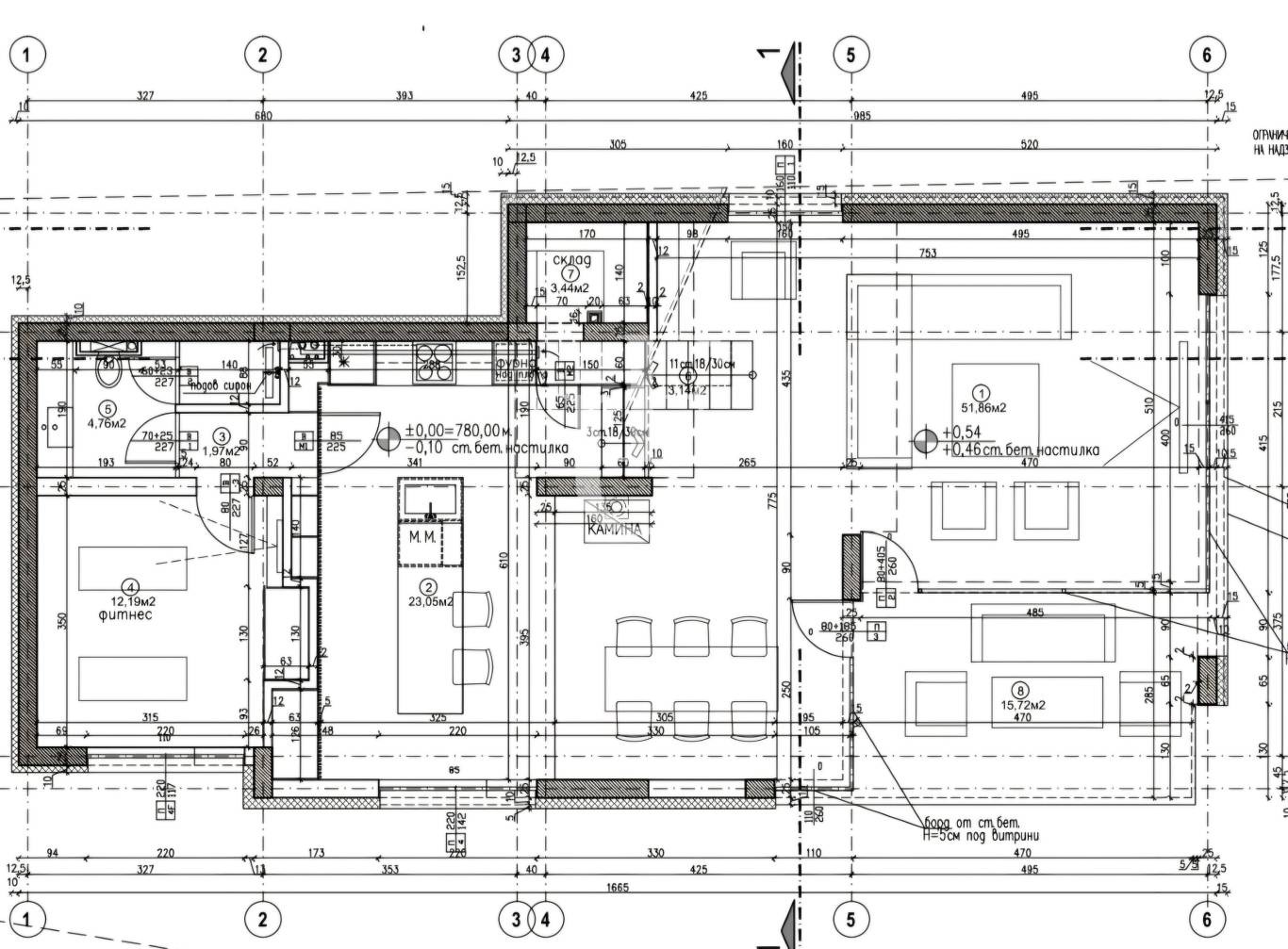 Първи етаж : просторна дневна зона с кухня с и трапезария и камина, склад, фитнес зала/кабинет/спалня, баня с тоалетна, тераса с излаз към градината.