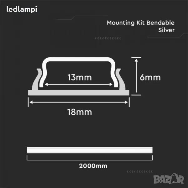 Алуминиев профил - гъвкав Матиран разсейвател Комплект с крайни тапи и щипки за монтаж Материал: Алуминий Степен на защита: IP20 Размери : Дължина - 2 000 mm Ширина - 18 mm Височина: 6 mm