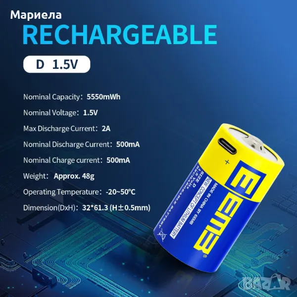 Акумулаторни Батерии D 1.5V USB Type 4бр. / Голям капацитет 1.5V 5550mAh