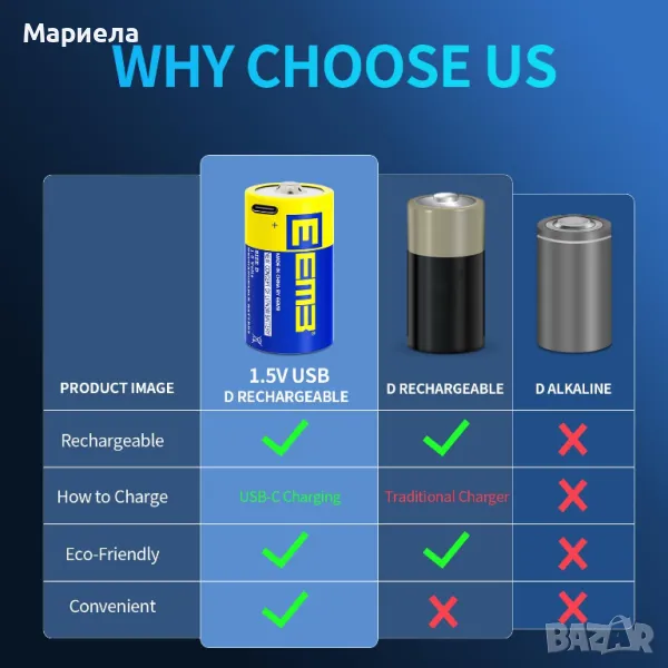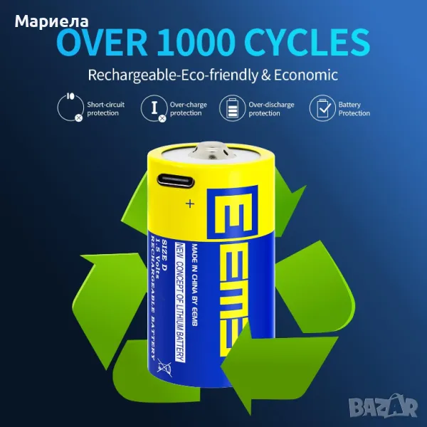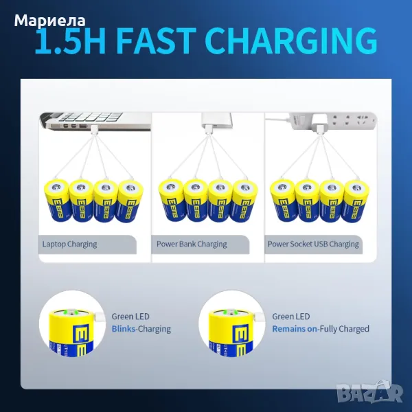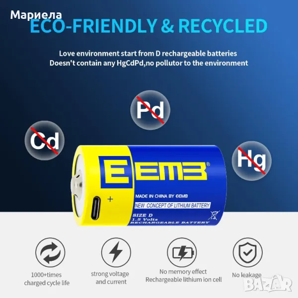 В тези батерии не се използват живак, кадмий и олово; D батериите могат да се презареждат над 1000 пъти, спестявайки хиляди алкални батерии и намалявайки значително количество отпадъци на сметищата. Независимо дали сте у дома или навън, можете просто да го зареждате с един USB порт.